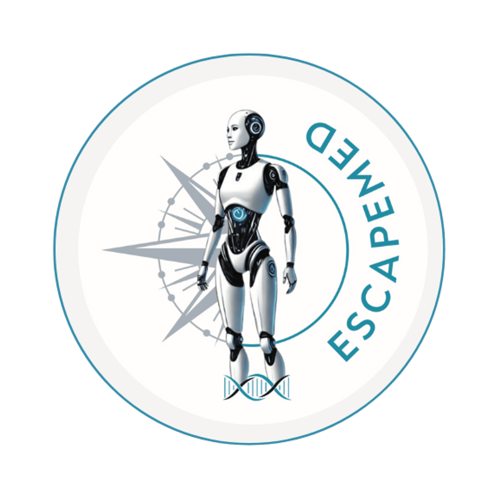 The EscapeMed logo combines three key symbols: the compass, the DNA spiral, and the avatar SIA (Silvia Intelligence Avatar).